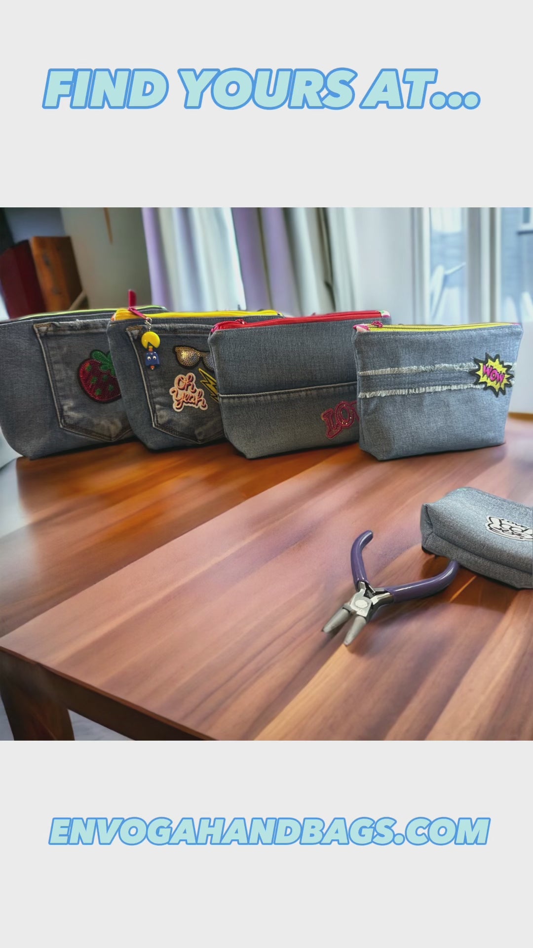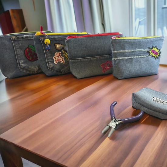 Practical zipper pouch for makeup, toiletries or other knick-knacks. Made with repurposed denim fabric. Decorated with an embroidered patch.